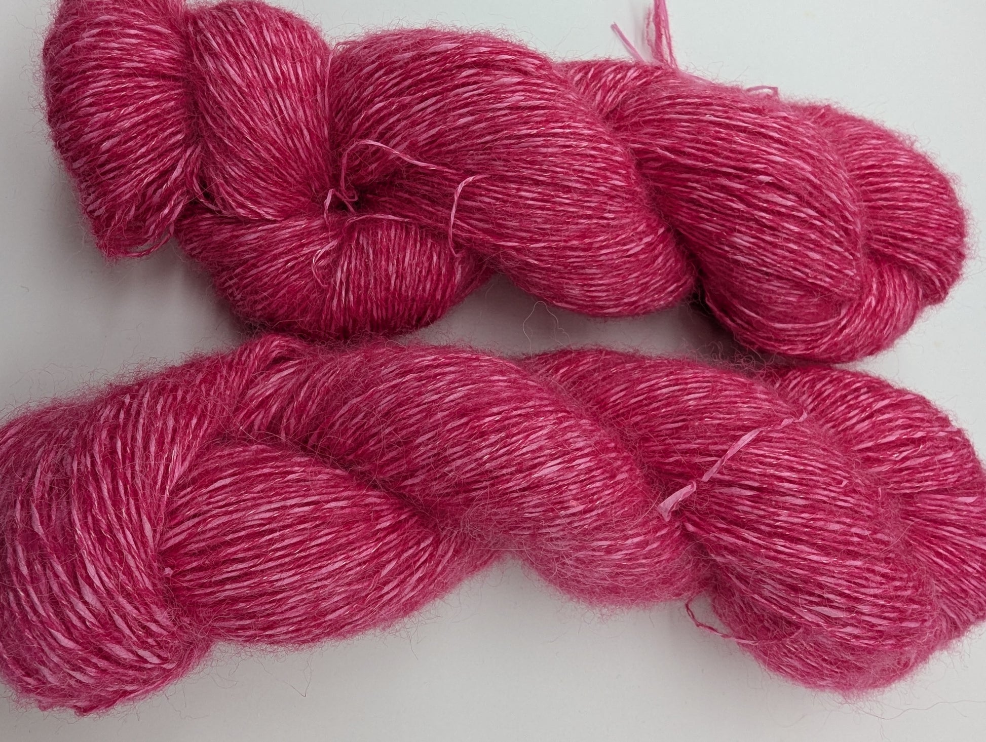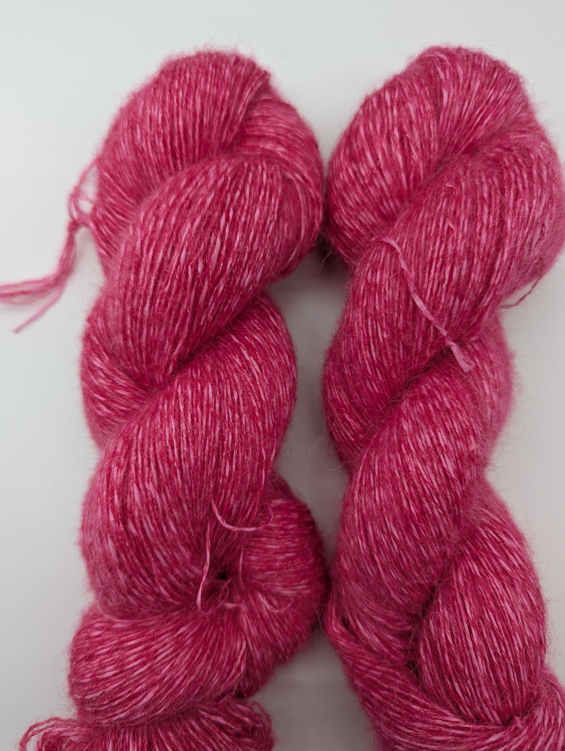 An unusual combination of fibres, this 4ply is 29% Wood Pulp, 20% Superfine Alpaca, 21% 20 Micron Merino Wool, and 29% Tencel. It has a delightful heathered effect from how the dye is absorbed by the different fibres.